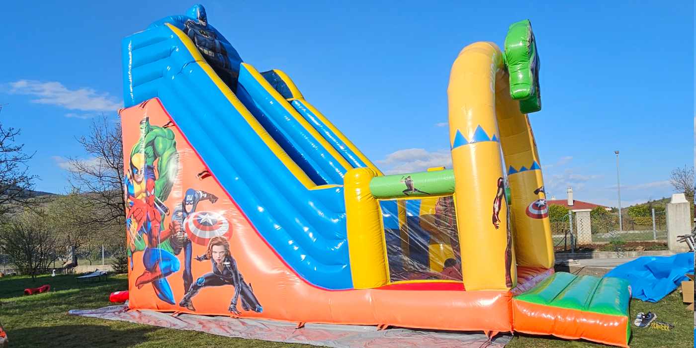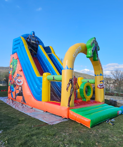 Napuhanac Superheroji prava je poslastica za veću djecu – super strmi i visoki tobogan garantira jurnjavu i navalu adrenalina i najvećima. Također ima zaštitnu mrežu kao mjeru opreza.