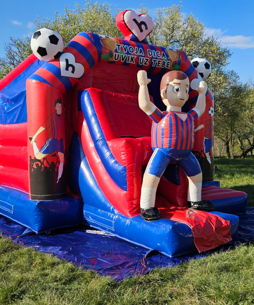 Napuhanac Splitska dica kombinacija je prostranog unutarnjeg prostora za skakanje i igranje loptama, kao i tobogana kroz koji prolazite između nogu nogometaša. Odličan je i za manju djecu, kao i za visinom ograničenije prostore.