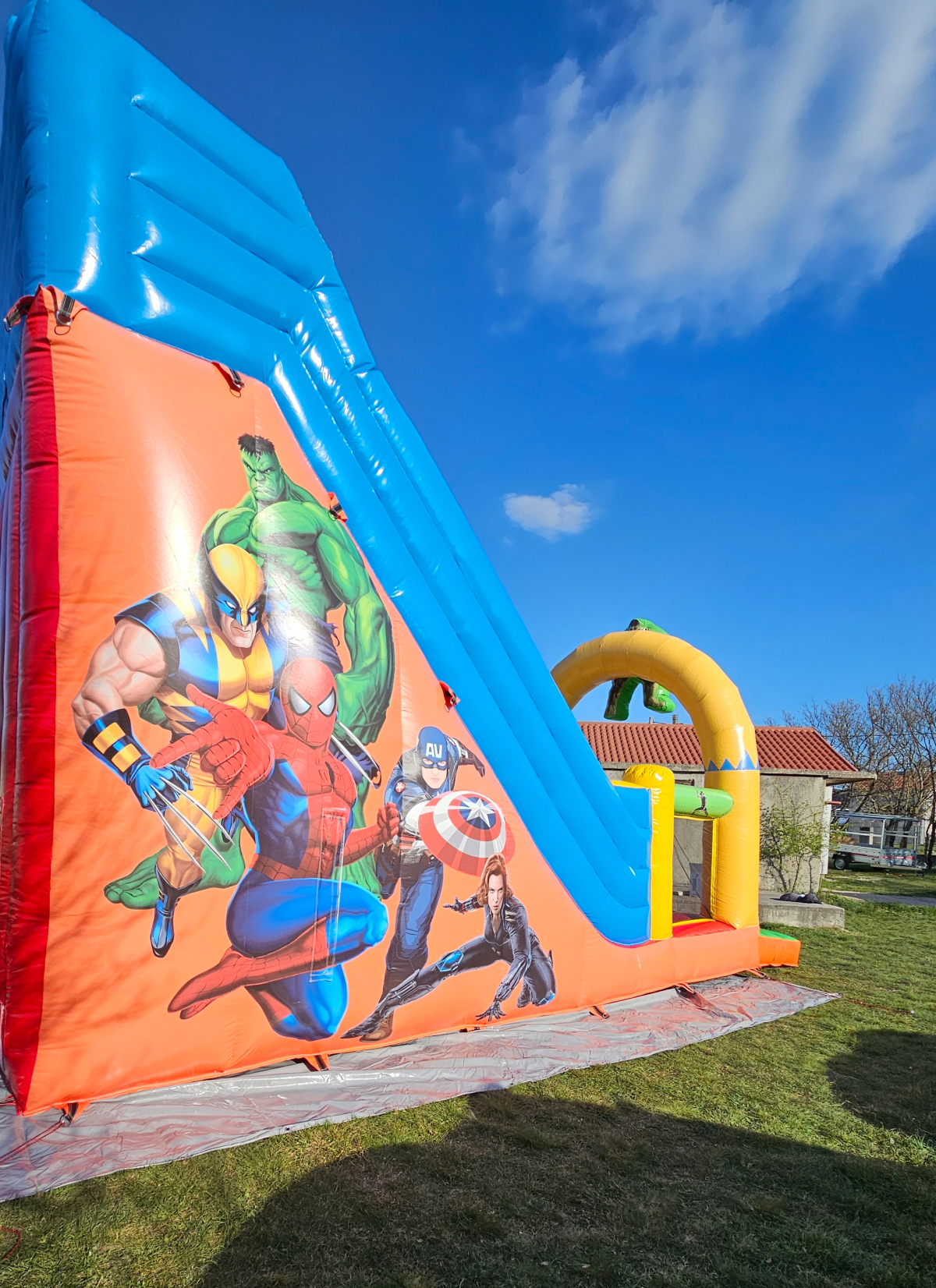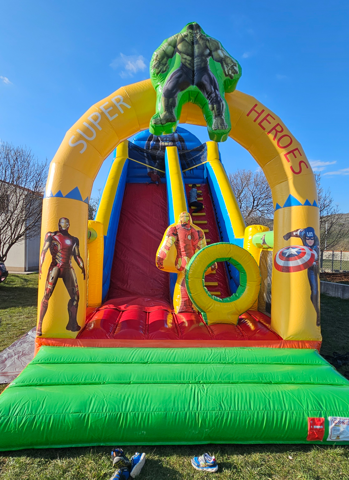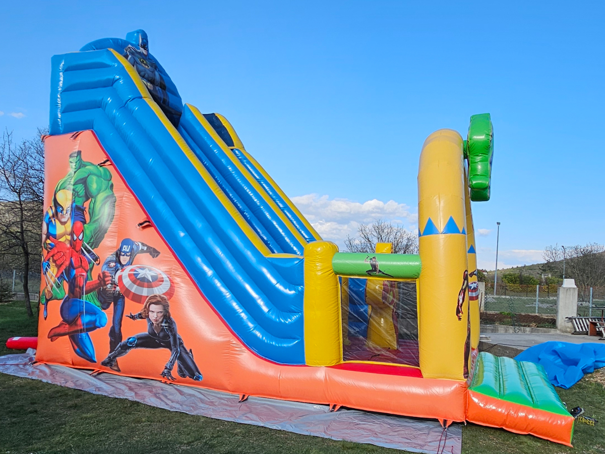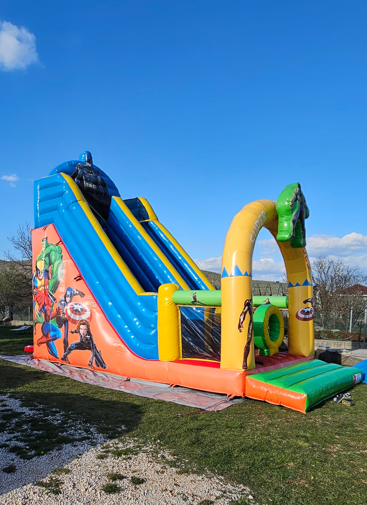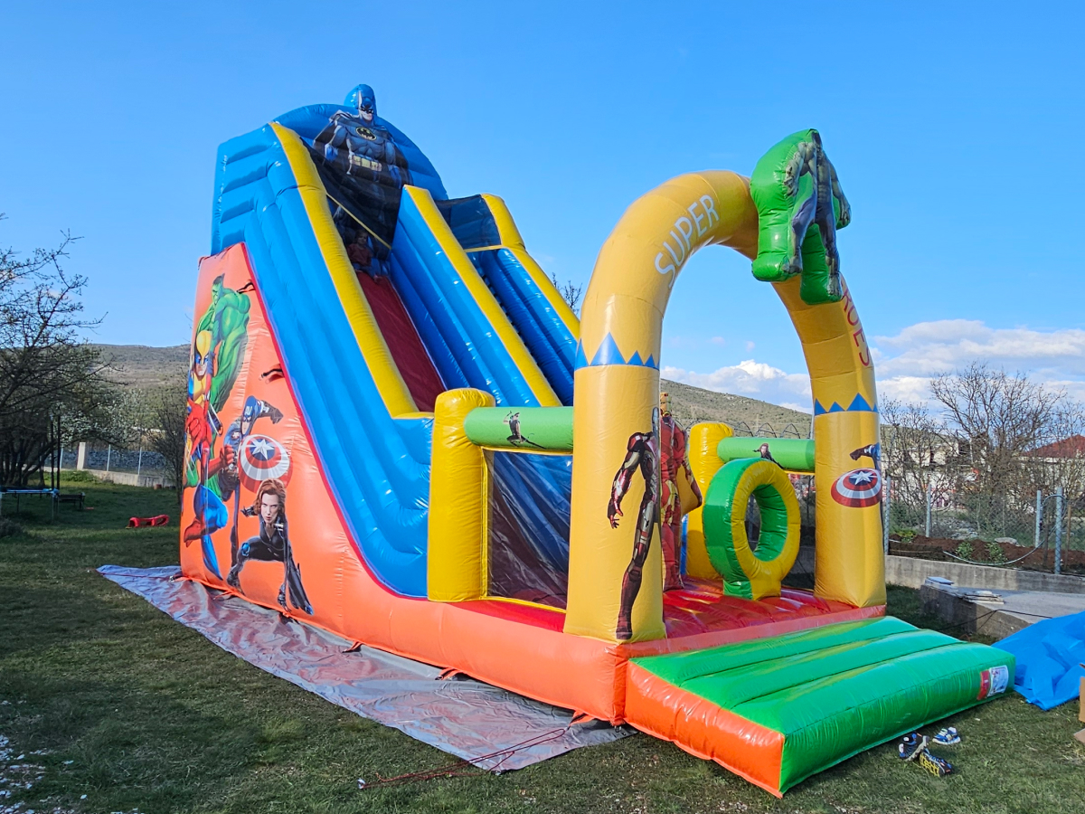 Napuhanac Superheroji prava je poslastica za veću djecu – super strmi i visoki tobogan garantira jurnjavu i navalu adrenalina i najvećima. Također ima zaštitnu mrežu kao mjeru opreza.